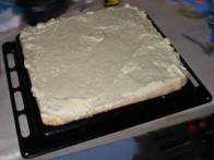 | Das untere Drittel des Bodens mit gut der Hälfte von der weißen Buttercreme bestreichen | Darauf das mittlere Bodendrittel legen. |